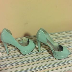 From call it spring, wore them once when I was in a wedding. Mint green/Aqua color, size 8.5, peep toe, about 4-4.5" heal with 1" platform