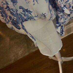 Aqua ladies, large floral step in sundress, long hidden back, zipper, elastic and back ties at the shoulders ruffle bottom lined from waist down. very feminine, delicate girly classy flow, super soft