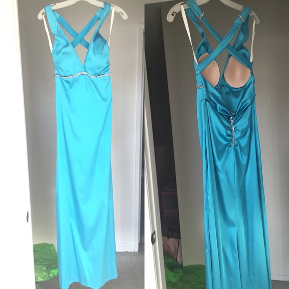 ONLY WORN ONCE. Crisscross straps in the back, rhinestone detail under bust line, on straps and in back. Cups in bust. Dress size is 2/4