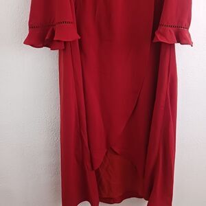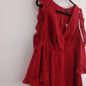 Aqua ruffle keyhole cold shoulder zip pleated faux wrap rust dress size M. new witj tags