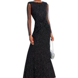 ✨ Sheer embellished sleeves and a floor-length hem for a dramatic, show-stopping look