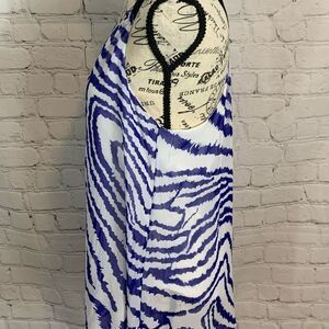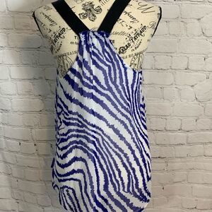 Aqua blue and white racer back tank top 100% rayon with 100% polyester lining.
