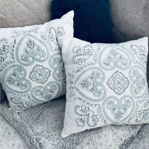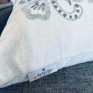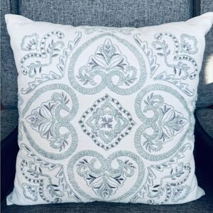 Artistic Accents Large luxurious throw pillow with light blue green aqua tone embroidered design. Excellent preowned condition with a couple very small “pulls” in the thread. 2 available at time of listing, please ask if interested in bundling both. Clean nonsmoking home. Zippered closure and removable cover.