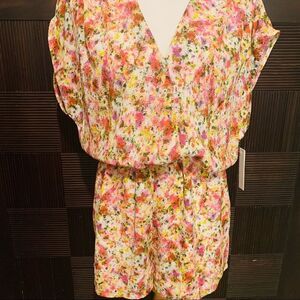 Beautiful summer romper in a vibrant floral watercolor print. Light and airy wrinkle resistant fabric drapes across the chest in a faux wrap style. Nips in at the waist. Perfect length shorts.