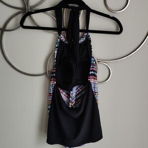 Flattering tankini halter style top. Pretty colors (different from stock photo) excellent preloved condition. No size tag but fits medium.