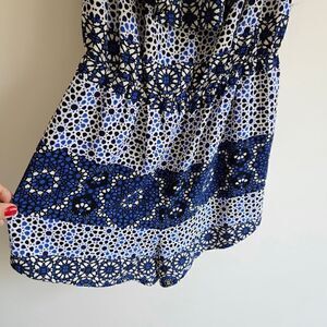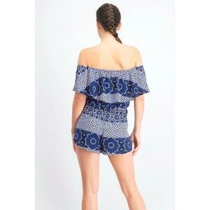 Can be worn on or off the shoulder. Flutter sleeved romper.