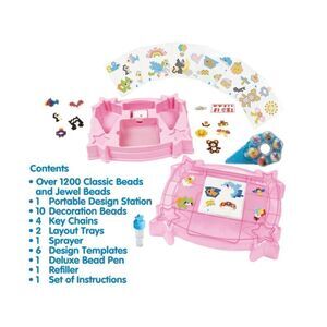 This kit includes portable work station, 2 layout trays, 10 decorations, 4 key chains, sprayer, refiller, 6 design templates, 1200 jewel and classic beads, bead pen that holds 12 colors and colorful instructions.