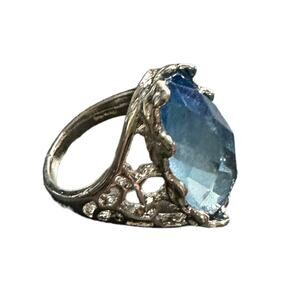 Beautiful faux aquamarine shimmering light blue with a silver colored metal band in a fancy filigree setting, birthstone for March, cocktail ring