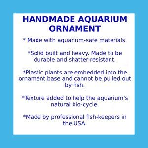 We create unique fish habitat decorations that are made with aquarium-safe materials. This ornament is made with non-toxic resin and the artificial plant is plastic. The base is filled with gravel or sand that is embedded in resin. Texture is added to the ornaments to add additional surface area to further aid in the aquarium nitrate cycle.