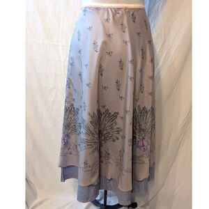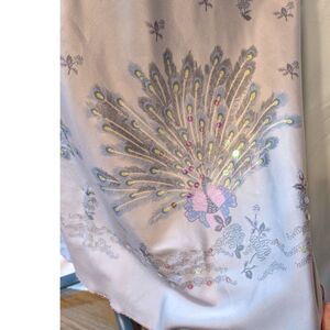 EUC multilayered skirt with rich sequined peacock like design on two-toned lilac and mauve skirt. Narrow elastic waist for easy and comfortable fit. Matte satin like material. A fabulous find for evenings out, parties, weddings, etc.
