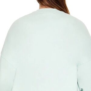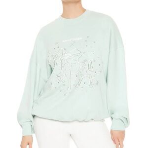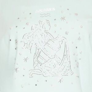 A fleece pullover featuring ribbed trim, chest 'Aquarius' embroidered text, a metallic beaded water bearer front graphic, rhinestone and faux pearl front embellishments, and dropped long sleeves.