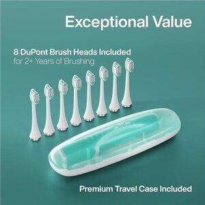 🧿8 DuPont Brush Heads & Travel Case Included - Every Vibe Series toothbrush comes with 8 brush heads engineered by world famous DuPont; a world leader in quality & materials science. Each brush head lasts 3 months so 8 will last for 2 years. Also included is a convenient custom hard shell travel case made of BPA-free plastic with space for two brush heads. Vibe Series can last 4 full weeks (2 min/2x a day) on a full charge so it's perfect for on the go travel with the included travel case.