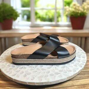 Elegant slip-on wedge sandals with crisscross leather straps. Comfortable cushioned footbed and jute-wrapped platform detail. Perfect for casual summer outfits or dressing up.