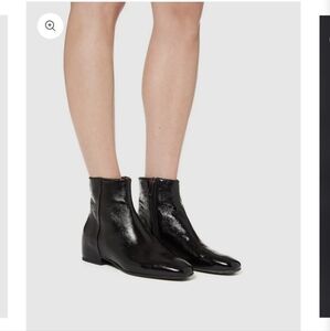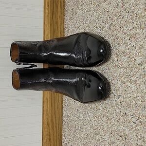 Aquatalia Sleek black patent leather boots. Stylish ankle height. sz 8. Made in Italy. side zip. leather insoles. rubber soles. minor scuffing at toes. (pictured, picture makes it look worse. it's not noticeable).