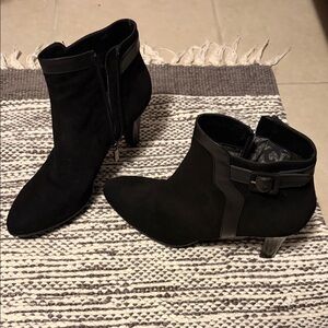 Chic black suede booties by Aquatalia. Sleek design with side zippers. Ideal for versatile styling. In box never used