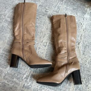 Step out in style with these elegant tan knee-high boots. Perfect for any occasion, these boots offer both comfort and sophistication.