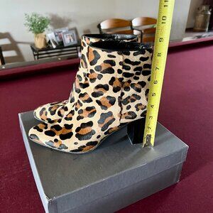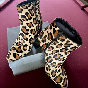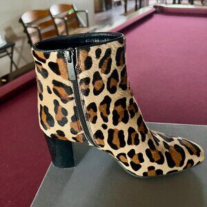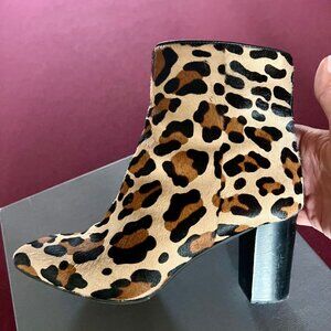 Sooooo ... one more pair of boots I REALLY don't want to part with, but just can't wear heels anymore! Up for your consideration is this lovely Aquatalia calf-hair bootie in an eye-catching leopard print. NOBODY is going to miss you in these, my dear ... they simply wouldn't DARE!!! I usually wear a 10 and actually sized up in these because I figured I would need a little extra room because of the slightly pointed toe -- but it wasn't an issue. In fact, I would say these were a tad too wide for me (needed cushioned socks), so keep that in mind. If you have a wider foot, I'd guess you may have found your perfect match in this pair.