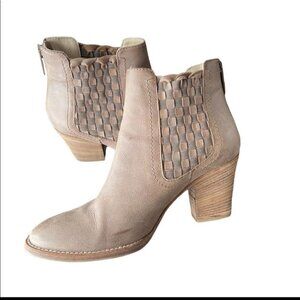 Aquatalia Frannie Weatherproof Suede Booties, Size 9.5. Woven Chelsea Design Sides, Zip Back Closure, Leather Soles, Made in Italy, 3" Heel. Designer Quality. Excellent Pre-Owned Condition. Wear as pictured