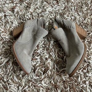 EUC pair of grey suede leather heeled booties from Aquatalia in a size 9. These boots have a zip closure and unique stitching pattern. One minor nick in the right heel as pictured. No other stains or flaws!