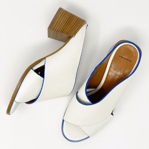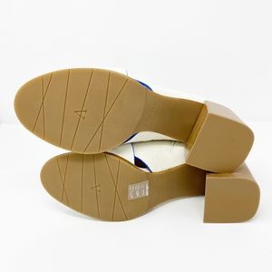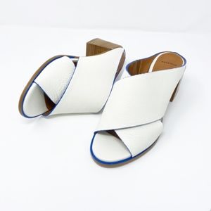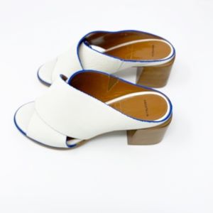 Features: aquatalia, open toe, slip on, crossover vamp, slightly padded foot bed, stacked block heel, made in Italy, white leather with blue exterior, approximately 2.25" block heel.