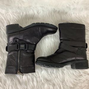 This is a pair of black leather, black metallic buckle and strap booties from Aquatalia. Made in Itlay. Outside zipper. Some wear on foot beds and soles. Creasing on vamp, light scuffs on toes. Biker, motorcycle, moto.