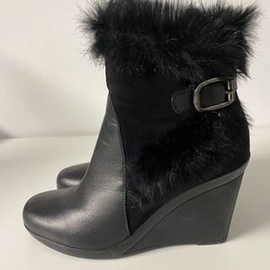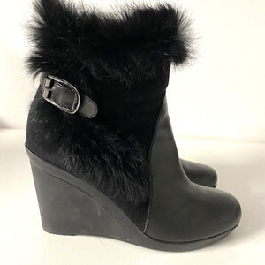 Aquatalia Natalie Black Ankle Wedge Heel Boot Leather Suede Faux Fur Rou…