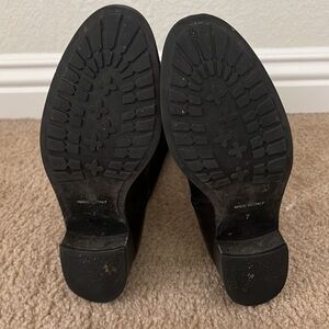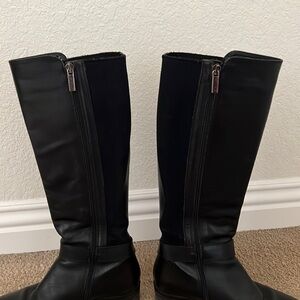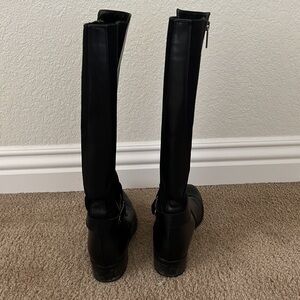 Worn, good condition, please see all pictures before purchasing. Knee High, Almond Toe, Zip entry. Strap buckle detail at the ankle. Elastic goring panels on the sides. Very minor scuffing/wear. In overall good pre-owned condition.