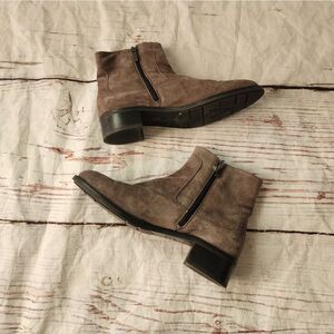 Gray weatherproof suede ankle booties with almond toe and inside zip closure. In good condition.