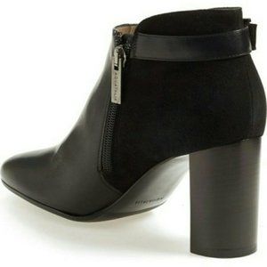 "A chic ankle bootie is expertly crafted in Italy from weatherproof leather and suede and lifted by a structural stacked heel.