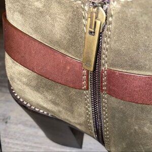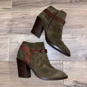 Aquatalia Womens 9.5 Olive Green Suede Heeled Booties Brown Leather Ankle Strap