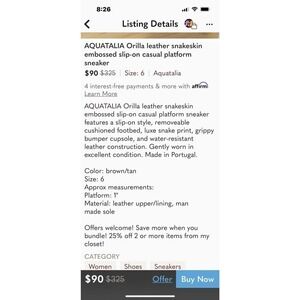 Aquatalia Women's Orilla Size 9 Sneakers Snake Embossed Leather Slip On