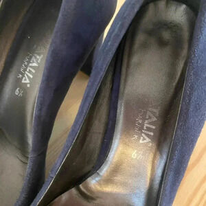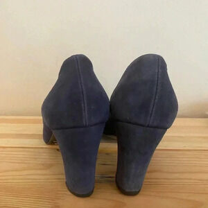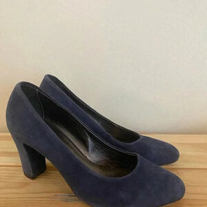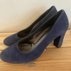 Aquatalia Classic Round Toe Blue Suede Chunky Square Heel Shoes Size 6.5. These shoes are pre-owned. Good Condition. No flaws. Heel measures 3 inches tall.
