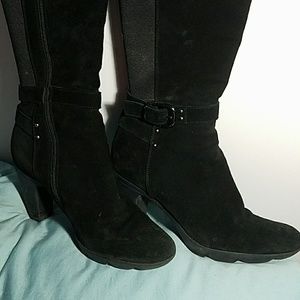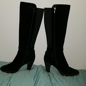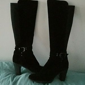 Aquatalia knee high weather resistant black suede rubber soled boots. Elastic panel in the back for stretch but Italian-style narrow shaft. Fits calf circumference 14in. No damage. Great condition- heels caps replaced. Original box. $175 obo.