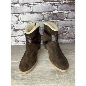 Selling Aquatalia Brown Suede Leather Faux Fur Strap Ankle Wedge Booties Boots Women’s Sz 10M US/41EU