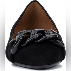 Chain-link hardware enriches the vamp of a creamy suede ballerina flat featuring a signature fuss-free water-repellent finish. Leather upper and lining/rubber sole Made in Italy