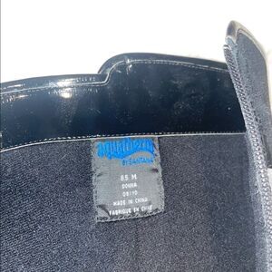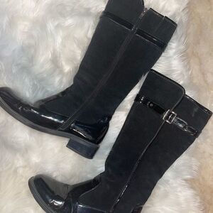 Black, tall, size 8.5. Black suede upper and pattern leather type material on the bottom. Not much wear on the bottom. Zipper inside close. Buckle that is adjustable at the top to tighten around the calf. Make me an offer!