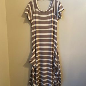 Features: sun dress, swim coverup, stripes, taupe and white, round neck, short sleeves