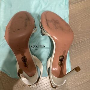 Worn only once, this 105 mm Babe Sandals in white satin has a beautiful silver crystal appliqué and cushioned leather sole. Size 36, true to size.