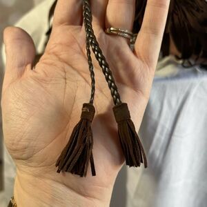 Features: Beautifully Italian crafted, suede fringe, wrap around, peep toe, heeled sandal. Braided leather straps with leather tassels. Super soft leather and amazingly comfortable.