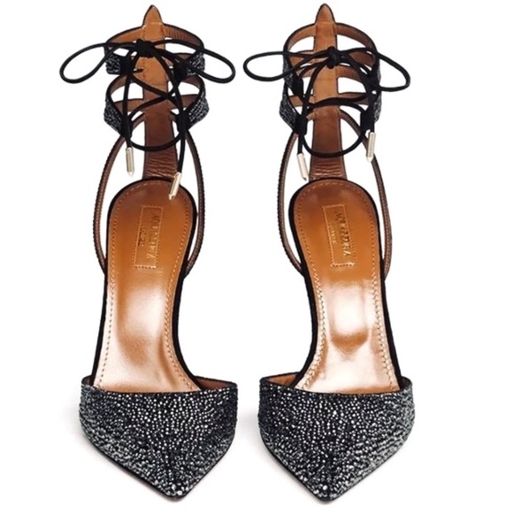 Aquazzura Amanda black suede crystal pave pumps with pointed toes and padded leather insoles. Wrap around ankle lace up closure.