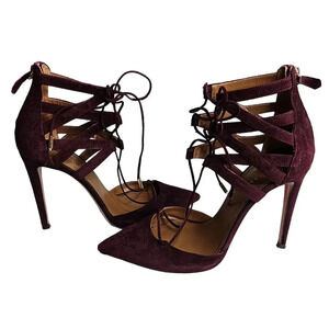 Aquazzura Belgravia 105 Suede Pump in Prune. Size 38.5 (US 8.5). Features pointed toe, stiletto heels, lattice side cutouts, suede leather upper, leather lining and soles, back zip, and lace-up closure. Excellent condition with normal signs of wear on soles. Box and bag included.