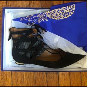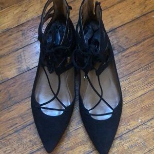 Super nice and chic! Good condition. Used a couple times. Comes with the box and dust bag. Black suede. Gold trim on bottom of heel. Lace up in the front. No returns. Purchase wisely.