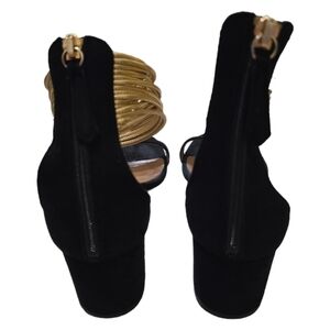 Aquazzura Black Suede Block Heels with Gold Multiple Straps at Ankle Back Zip