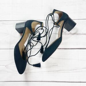Suede block-heel pump with wraparound tasseled ties