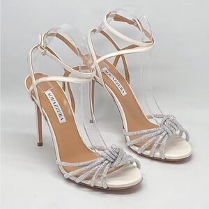 These Aquazzura high-heel sandals feature a knotted vamp embellished with glittering crystals. A strappy ankle detail and a stiletto heel define this metallic style.