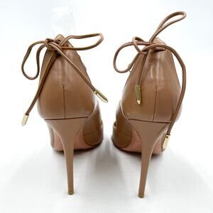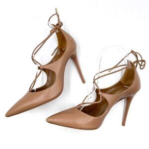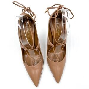 Aquazzura Christy Pumps Tan Leather Heels Curvy Lace Up Pointed Toe Sz 37 / 7 US