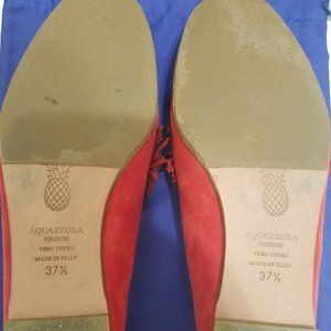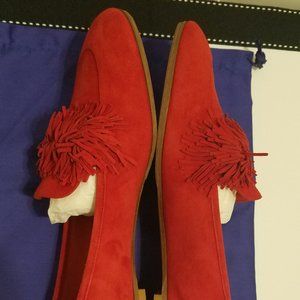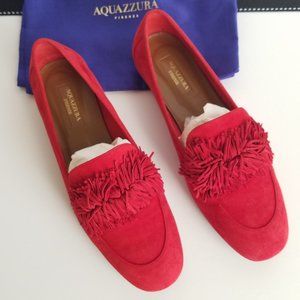 Aquazzura "Wild Thing" fringe flat shoes in a soft supple red suede. If you know this brand then you know the exceptional quality of their suede. This pair is a size 37.5 and were worn one time. They have already been soled on the bottom and tapped in the back for protection.