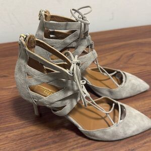 Aquazzura Frienze Belgravia light gray suede pumps featuring pointed toe, lace up closure at upper, zip closure at heel. Leather lining, inner sole and outsole.