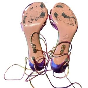 These stunning Aquazzura heels feature a captivating blend of purple and gold, with delicate straps that elegantly wrap around the foot. The tall stiletto heel adds a touch of sophistication, making them perfect for any glamorous occasion. Crafted with a slight sheen, these open-toe sandals exude luxury and style.