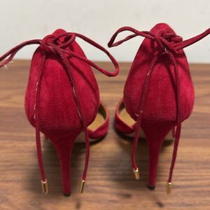 Features crisscross upper, ties at back of ankle, red suede leather, pointed toe, covered heel counter, padded leather lining, leather outsole.
